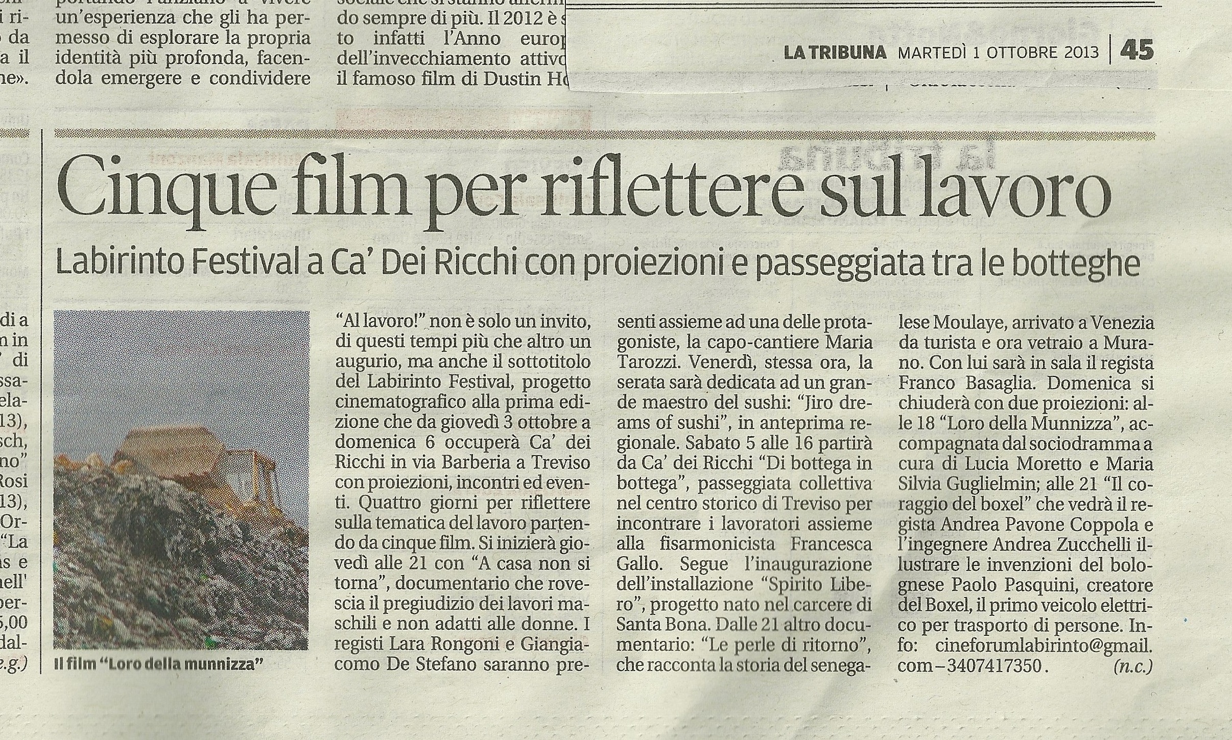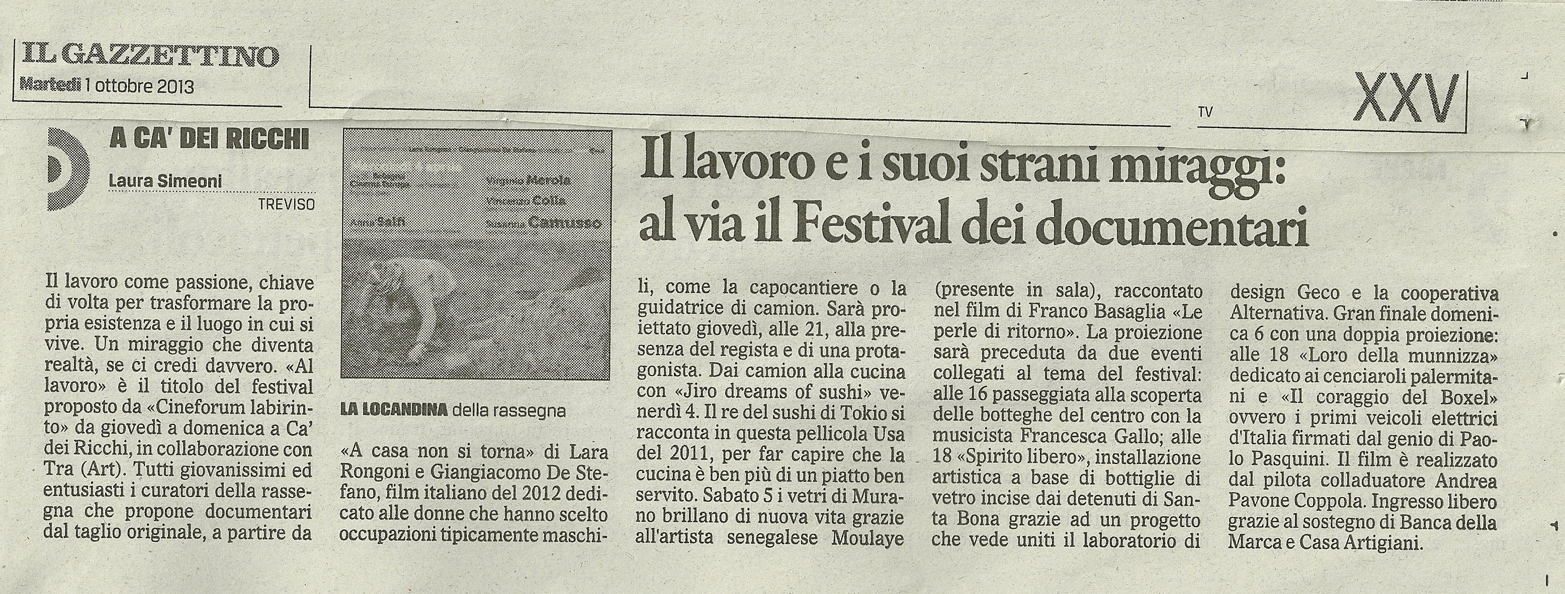 - Il lavoro e i suoi strani miraggi: al via il festival dei documentari – Il Gazzettino 1/10/2013