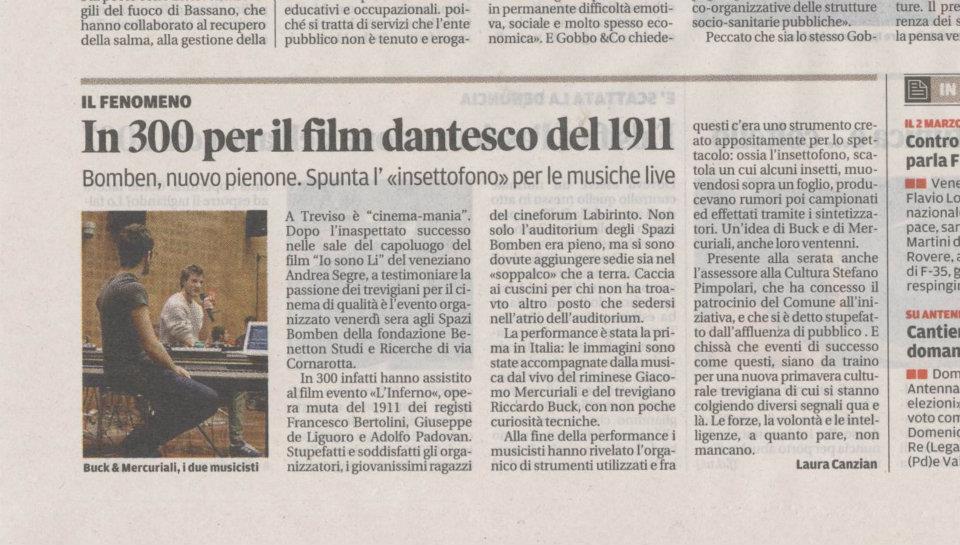 - “Inferno”, musica dal vivo per il film del 1911 – Il Gazzettino 24/2/2012