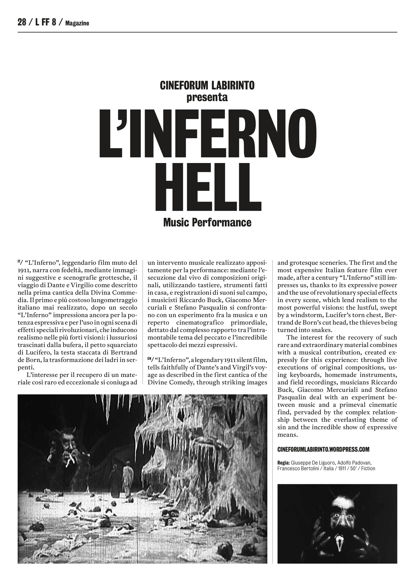 L’interesse per il recupero di un materiale così raro ed eccezionale si coniuga ad un intervento musicale dal vivo realizzato appositamente per la performance. A cento anni dall’uscita del film – avvenuta per la precisione il 10 marzo 1911 –, l’esperimento fra musica e cinema è quanto mai stimolante proprio per la tipologia del reperto cinematografico: una sequenza di immagini pittoresche che rievocano con scenografie grottesche il viaggio di Dante e Virgilio. Mediante l’esecuzione dal vivo di composizioni originali, utilizzando tastiere, home-made instruments e field recordings, i musicisti Riccardo Buck e Giacomo Mercuriali si confrontano con un reperto cinematografico primordiale a partire dal complesso rapporto fra l’intramontabile tema del peccato e l’incredibile spettacolarizzazione dei mezzi espressivi.